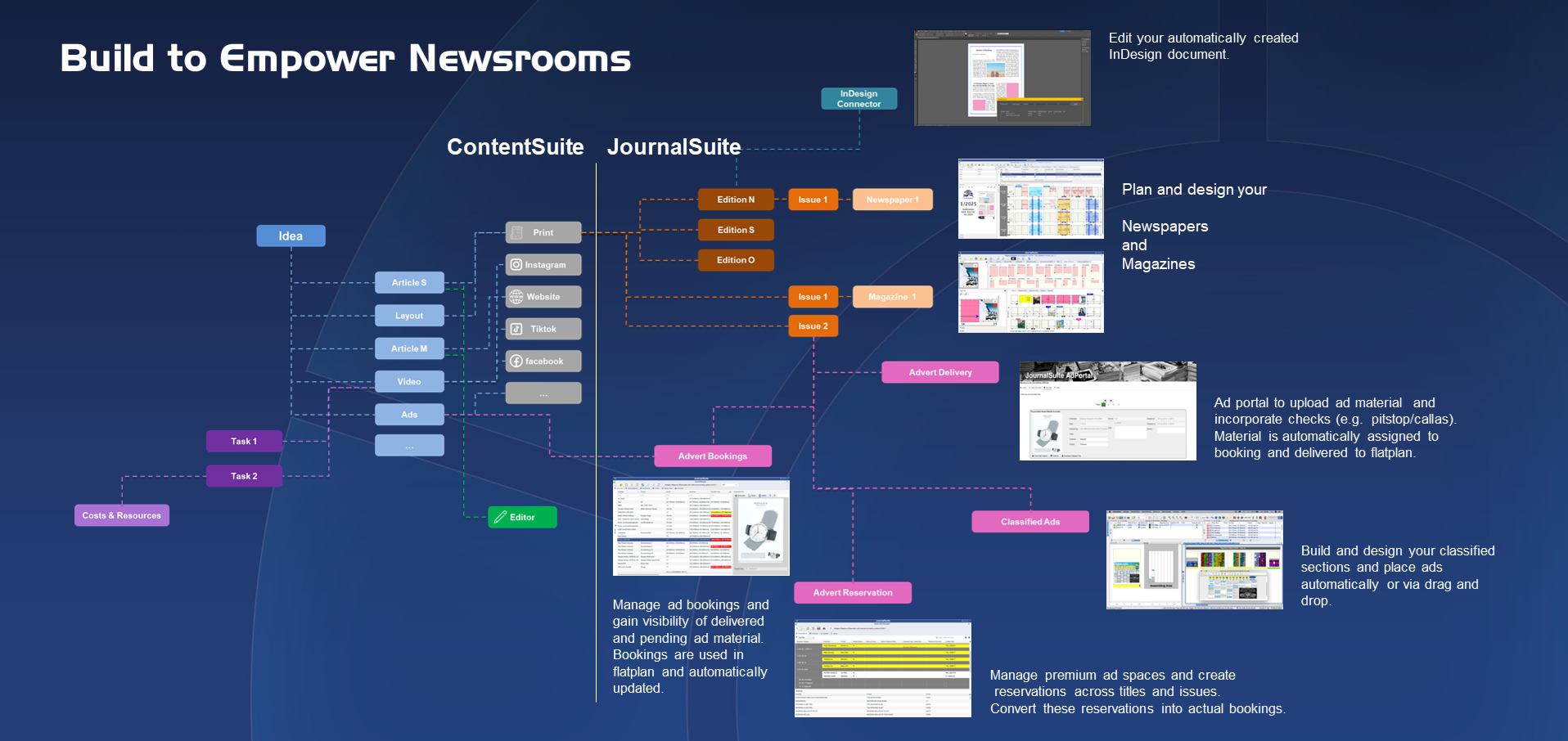 Create your flatplan for your print publications considering adverts, inserts, templates and individual layout.